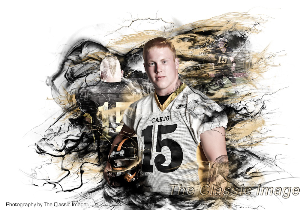 It is a combination of an image taken in the studio, and a few taken on the football field. The combination of the photos with the design elements makes a really powerful portrait, one that works well for our senior, a football player and all-around athlete.